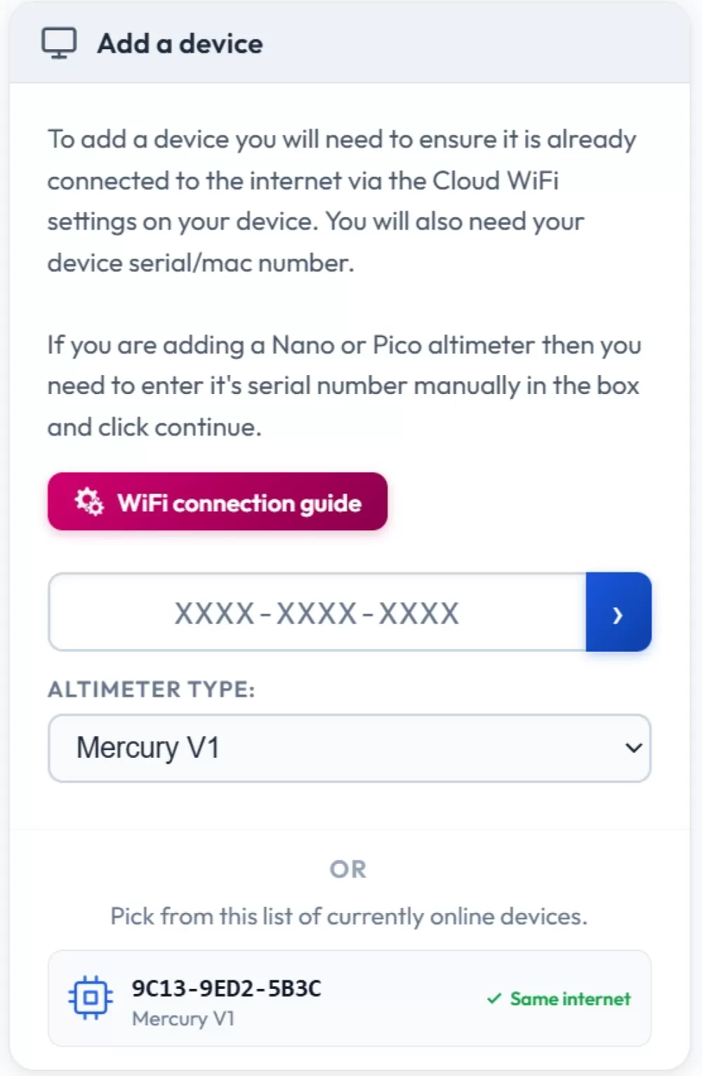Nu u met het internet verbonden bent, kunt u uw apparaat toevoegen aan uw account op de Altimeter Cloud.